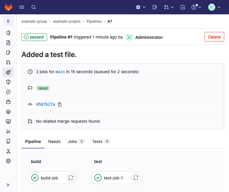 Once you commit this file to the project, the pipeline gets created. GitLab automatically has any available runners pick up the pipeline job.
