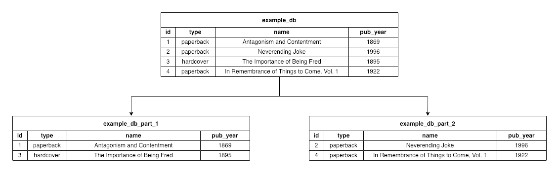 Here, the initial database (example_db) gets partitioned into two databases (example_db_part_1 and example_db_part_2). Each partition, or “shard”, gets some rows from the initial database.